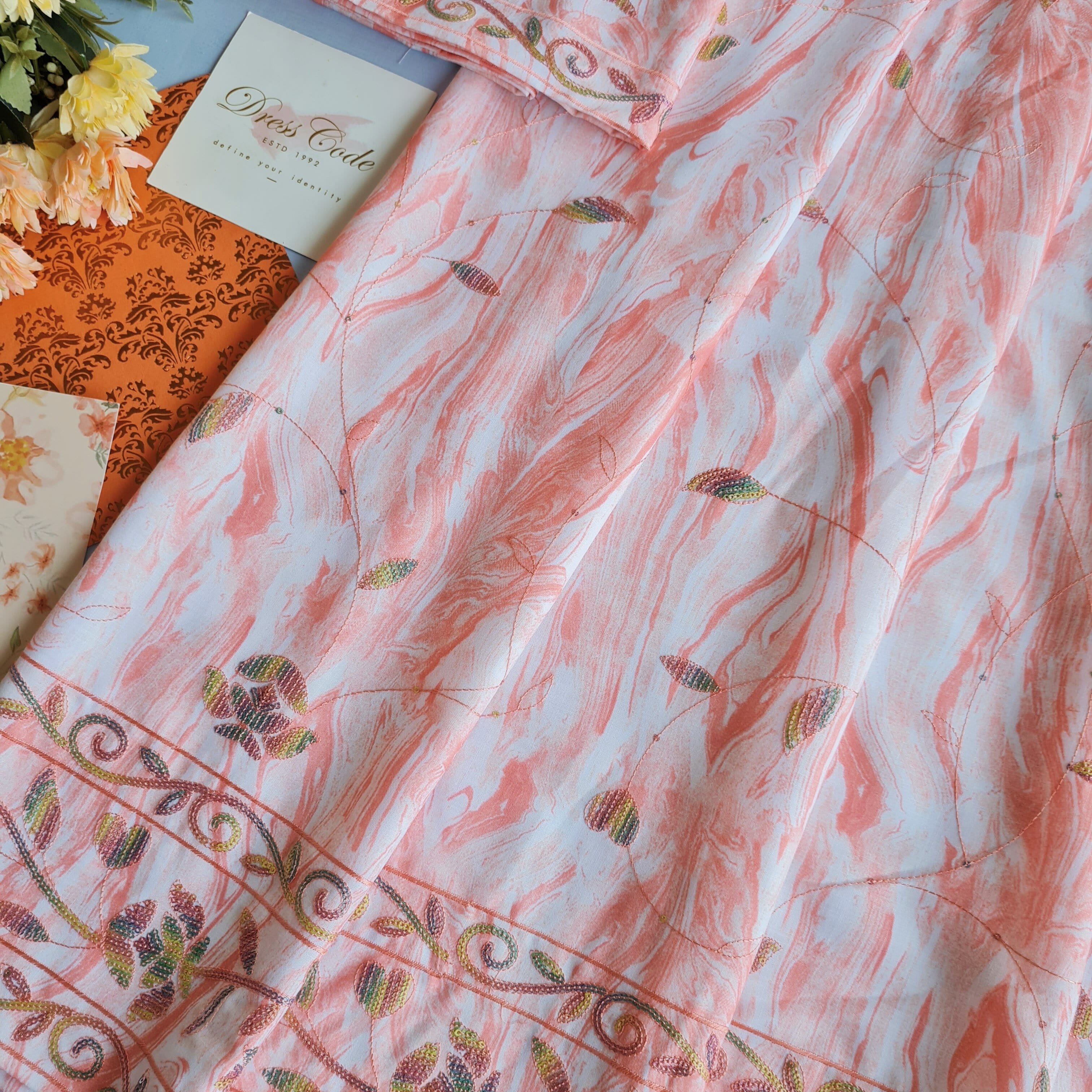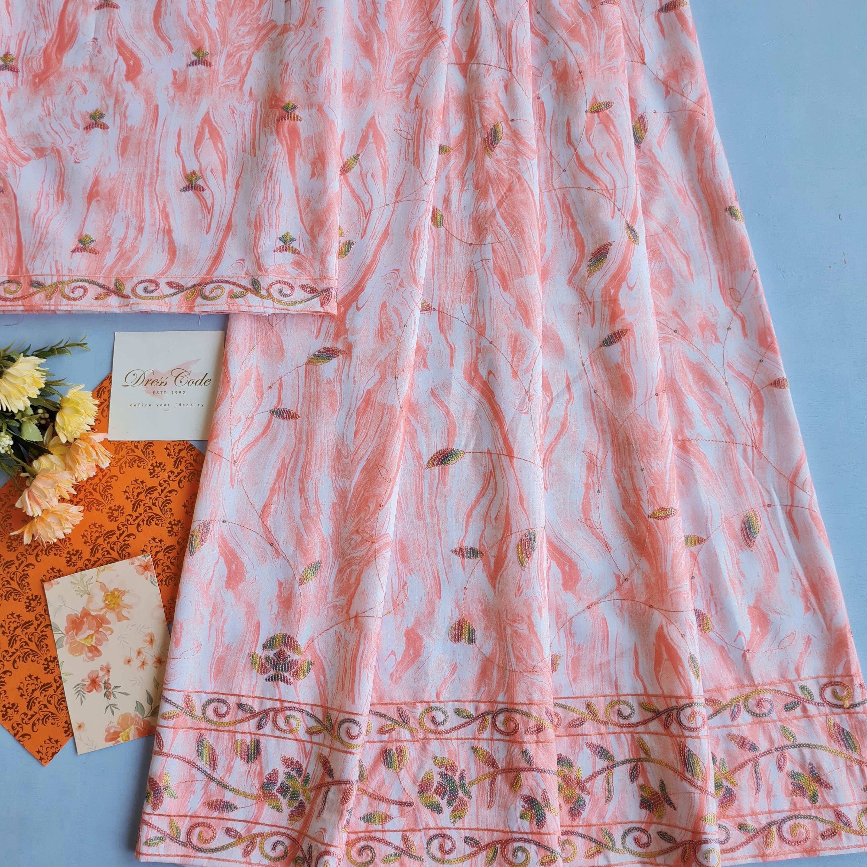 Printed base delicately embroidered with thread and sequins , all over the ghaghra ,and matching buttis in the pardi aesthetically created for the particular design is on poly cotton fabric, soft and comfortable.